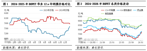 2025年四季度聚酯产业链呈现显著上行态势,其中原料端率先上涨,带动其他下游同步上行。上游原料PX及PTA涨幅均在10%以上。其中PX价格季度内最高突破900美元/吨,PTA突破5000元/吨关口。此次上涨核心驱动在于供需改善与“反内卷”消息面以及成本端支撑,PX方面,调油需求提前启动改善市场心态,叠加PX供给弹性有限,推动价格率先走强;PTA则因开工率维持低位,库存持续去化,同时多套装置跳停提振市场乐观情绪,并且2026年无新增产能、供需结构改善的强烈预期下,使其成为年末市场交易的多配品种,年末迎来上行行情。成本的快速拉升使BOPET毛利承压,下游受“买涨不买跌”心态支撑,刚需订单稳步跟进,前期低价货源提货积极性增强,正向反馈BOPET市场,膜价顺势上涨,季度内上涨幅度在8.56%。原料端2026年虽然未能突破前期新高,但长时间在高位盘整,对BOPET市场成本端仍显有利支撑。