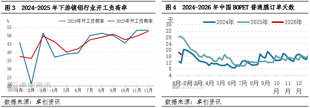 BOPET最大的下游需求领域为包装,占比接近50%,其中镀铝行业是包装中最大的下游。从数据来看,镀铝行业2025年四季度月度开工负荷率由47.59%稳步抬升至52.71%,抬升5个百分点以上,表明镀铝企业开工积极性较高,对BOPET消耗增强。从BOPET生产企业未交付订单天数也能看出,由12天附近抬升至17天附近,抬升5天左右。下游开工稳步抬升,企业订单逐步跟进,需求端对BOPET支撑增强。